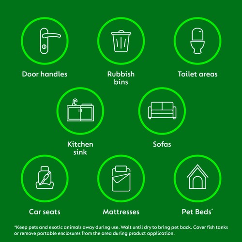 Use for: Door handles, Rubbish bins, Toilet areas, Kitchen sink, Sofas, Car seats, Mattresses