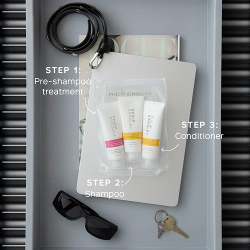 This Philip Kingsley jet set provides a three-step regime designed for fine, limp hair. It enhances body, volume, and shine while effectively detangling without weighing the hair down. The set is ideal for managing flyaway strands when travelling or on the go.