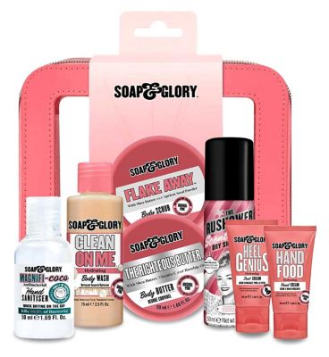 This Soap & Glory The Travel Bundle offers a selection of essential body care miniatures housed within a branded zippered bag. It provides a comprehensive collection for cleansing, scrubbing, moisturising, and sanitising while away from home. The included toiletries set ensures your routine remains uninterrupted during travel.