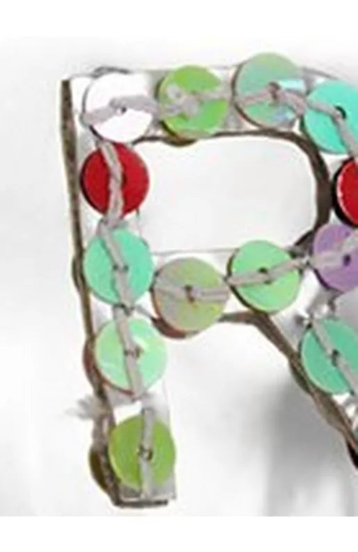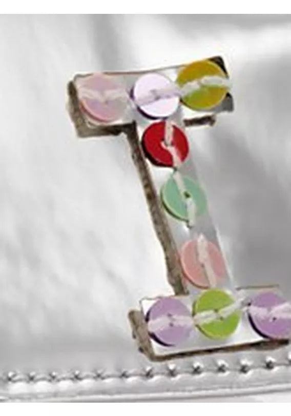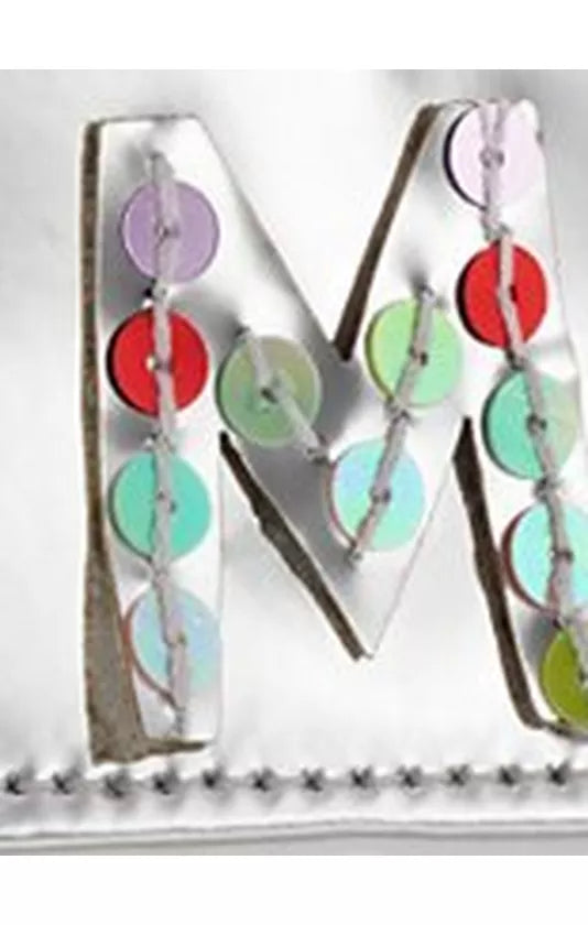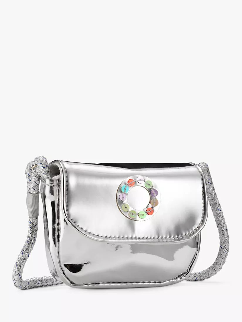 Diese verspiegelte, metallisch glänzende Mini-Tasche ist mit einem Initial und Paillettenapplikation verziert. Eine Klappe mit Druckknopfverschluss und ein langer Schultergurt aus Seil runden den Gesamteindruck ab.