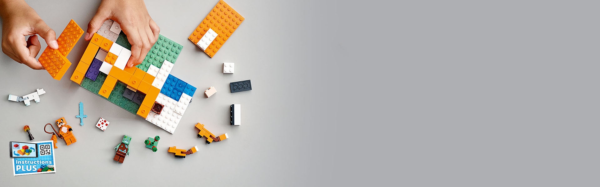 Kinder nutzen ihre Minecraft-Fähigkeiten, um ein Haus in Form eines schlafenden Fuchses zu bauen. Dank der offenen Rückseite und des abnehmbaren Daches können sie die Möbel ganz einfach anordnen und im Inneren fantasievolle Rollenspiele spielen. Draußen warten ein Fuchsbaby, ein ausgewachsener Fuchs und ein Polarfuchs darauf, mit Beeren gefüttert zu werden, bevor sich die Tiere zum Schlafen zusammenrollen. Ein beliebter Charakter aus dem Spiel, der ertrunkene Zombie, taucht auf und richtet Chaos an. Die Kinder müssen ihn zunächst mit einem Schwert abwehren, bevor sie es gegen eine Angelrute tauschen und angeln gehen können.