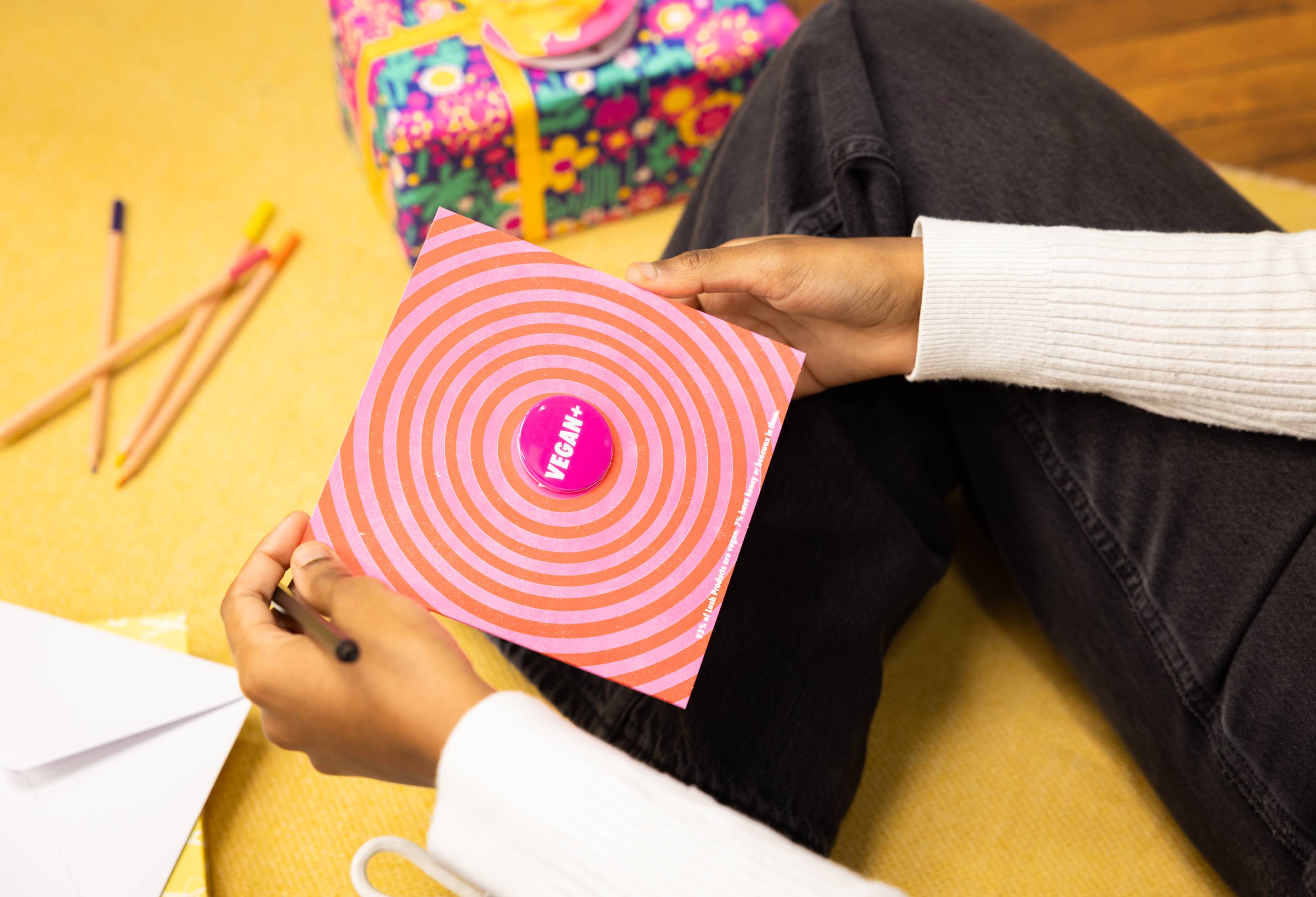 Diese Grußkarte besteht zu 100 % aus Recyclingpapier und wird mit einem abnehmbaren Anstecker aus recycelten Joghurtbechern geliefert. 7 % der Lush-Produkte enthalten Honig oder Bienenwachs, der Rest ist komplett vegan. Egal, ob du oder die beschenkte Person vegan lebt oder vegan mit Honig – trage diesen Anstecker mit Stolz. Er passt perfekt zu jedem handgemachten Geschenk von Lush.