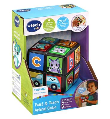 Play and learn with the VTech Twist & Teach Animal Cube, designed specifically for small hands. Turning the cube left or right triggers fun, spoken phrases that introduce animals, colours, phonics, and vehicles. This interactive cube enhances understanding of cause and effect through playful exploration.