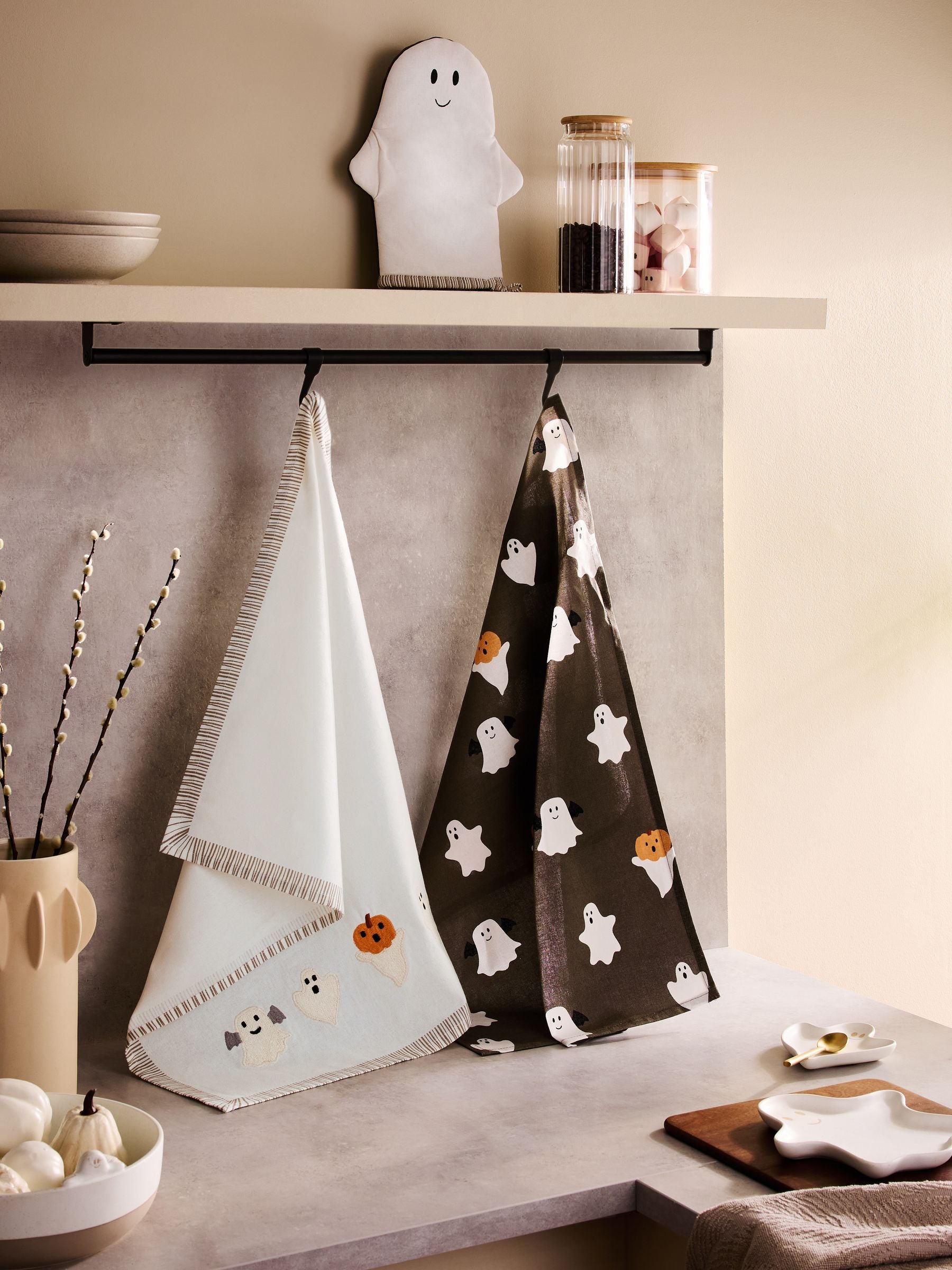 Ce kit de cuisine effrayant contient un torchon imprimé amusant, une serviette brodée texturée et notre adorable manique Gus le Fantôme. Idéal pour préparer votre cuisine à Halloween !
