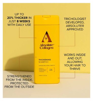 Read MoreAbsolute Collagen Thickening Collagen Complex Shampoo is the UK’s first collagen complex formulation shampoo that works to nourish, thicken, and volumise thinning hair, while maintaining that all-important lightness.