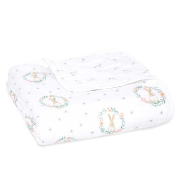 This Aden + Anais Essentials blanket features a soft, blush-toned design incorporating charming bunnies nestled within delicate floral wreaths. Crafted from breathable muslin fabric, this essential item provides gentle comfort for your baby. It is designed to be lightweight yet durable enough for everyday use and frequent washing.