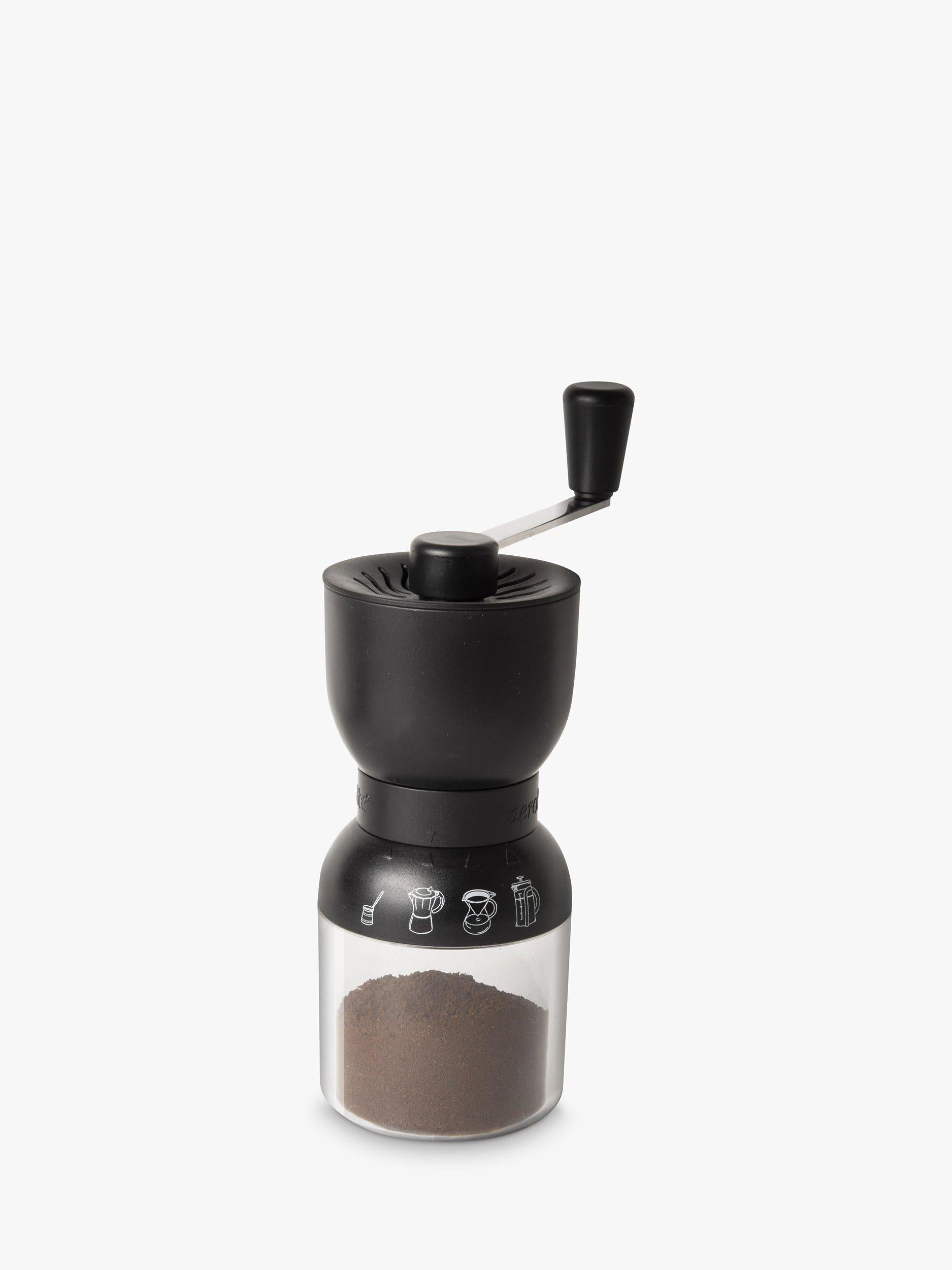 Moulin à café Aerolatte simple et pratique. Adapté aux débutants comme aux experts, il est facile à régler grâce à ses quatre réglages de mouture prédéfinis. Il suffit de sélectionner votre méthode de préparation préférée sur la bague du moulin, d'ajouter les grains et de tourner la manivelle.