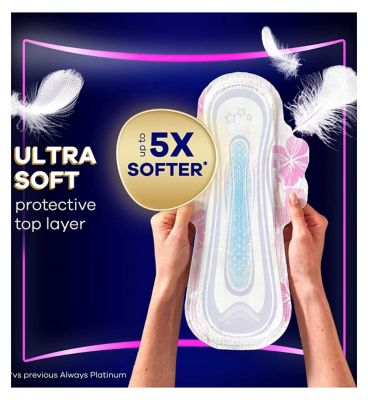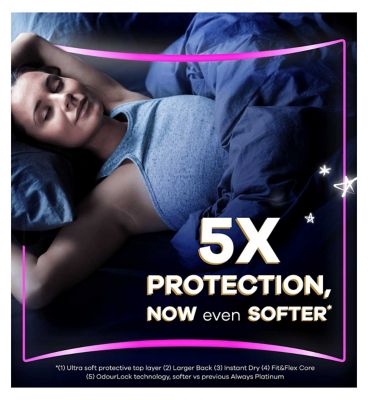 Read MoreAlways Platinum Sanitary Towels with ComfortLock wings are designed to give you better fit* for up to zero leaks, zero shifting and zero discomfort. With Always Platinum Pads your period is the last thing on your mind. Always Platinum Secure Night (Size 4) have a 60%* larger back, so you get more protection where you need it most. *vs. Always Platinum Normal (Size 1)