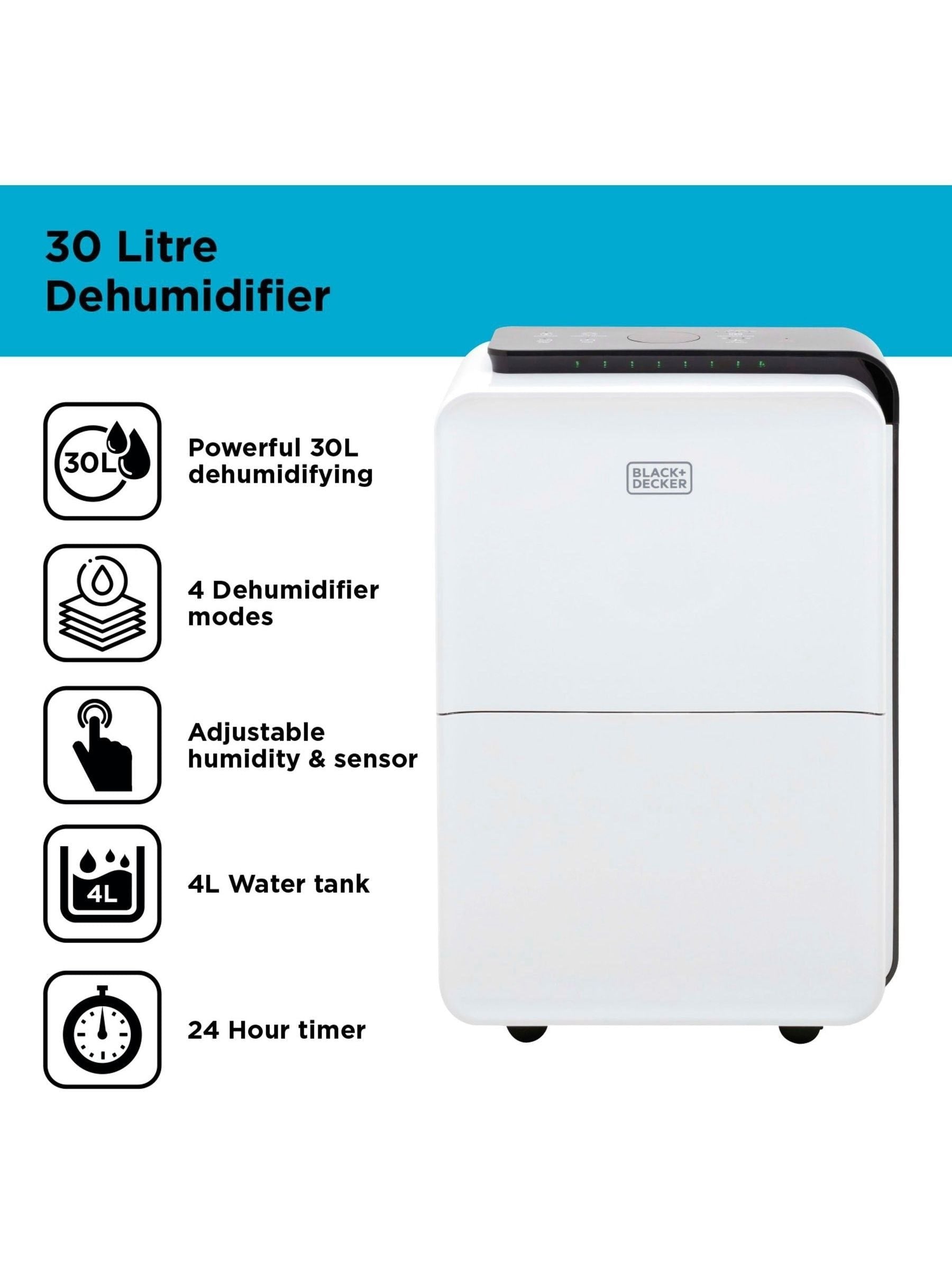 DÉSHUMIDIFICATION PUISSANTE : Sa technologie haute performance élimine l'excès d'humidité pour prévenir la formation de moisissures dans les pièces jusqu'à 40 m², les placards et les armoires. GRAND RÉSERVOIR D'EAU DE 4 L : Ce grand réservoir est conçu pour extraire jusqu'à 30 litres d'humidité par jour à des températures comprises entre 5 et 32 °C. MINUTERIE 24H INTÉGRÉE : Programmez facilement la minuterie pour allumer et éteindre l'appareil et ainsi économiser de l'énergie et réduire vos coûts d'utilisation. FONCTIONNALITÉS 4 EN 1 : Choisissez parmi 4 modes de fonctionnement pour lutter contre l'évaporation de l'humidité ambiante : déshumidification puissante pour protéger votre maison ; extraction continue de l'humidité ; séchage du linge plus rapide et plus efficace ; filtre à charbon actif pour éliminer les particules et les gaz et purifier l'air. GARANTIE 2 ANS : La qualité BLACK+DECKER est garantie 2 ans.