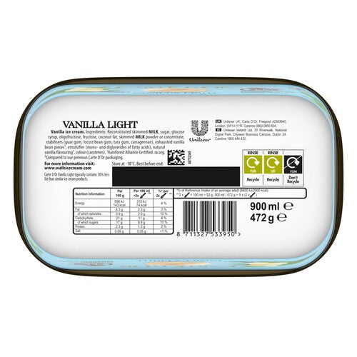 Read MoreCarte D'Or Madagascan Vanilla Light Ice Cream Dessert – a much-loved classic at its best, now available in a paper tub! Spoil yourself, family, or friends, with a moment of irresistibly smooth vanilla that contains 30% less fat than similar ice cream products. Hand-picked and sustainably sourced Madagascan vanilla beans give our ice cream its rich and authentic taste. As well as delivering a truly delicious dessert experience, we want our impact on people and planet to be a positive one. That's why we source Rainforest Alliance Certified Vanilla for our ice cream and in addition, we support farming communities in the SAVA region of Madagascar via the Wall’s "Vanilla for Change" programme in partnership with Save The Children and expert vanilla supplier Symrise. This programme has already made a difference to the lives of 60,000 people. What's M'Or, our ice cream is now available in a responsibly sourced paper tub that is recyclable and made with 93% less plastic*. Carte D’Or has been the expert in creating delicious desserts since our culinary beginnings in Paris. Today, we combine the finest ingredients with over 40 years of knowledge and skill to craft a truly indulgent dessert experience. Why not try a scoop of Madagascan Carte D’Or Vanilla Light on the side of your favourite dessert to elevate it to new extremes? Delicious on the side of a piping hot apple crumble and divine scooped on top of a dark chocolate brownie for an indulgent treat, this frozen dessert is perfect to enjoy and share at mealtimes with family and friends. If you like this Carte D’Or Ice Cream Dessert, why not try other popular flavours, including Indulgent Chocolate, Rich Salted Caramel, or Delightful Strawberry? *Compared to previous Carte D’Or packaging.