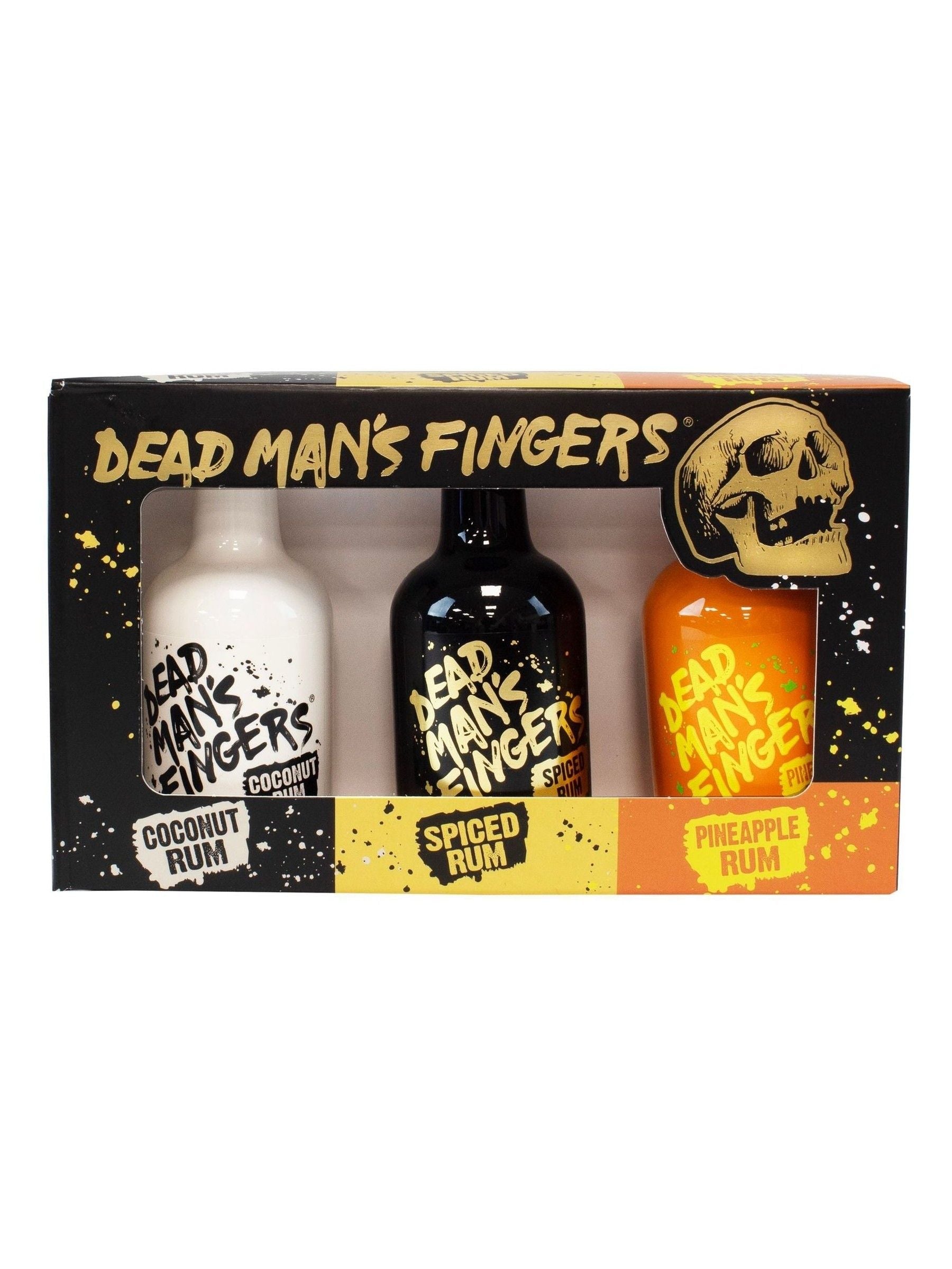 Coffret cadeau de rhum premium miniatures de 5 cl : 1 x Dead Man's Finger Spiced Rum 37,5 % ABV, 1 x Dead Man's Finger Mango Rum 37,5 % ABV, 1 x Dead Man's Finger Cherry Rum 37,5 % ABV.