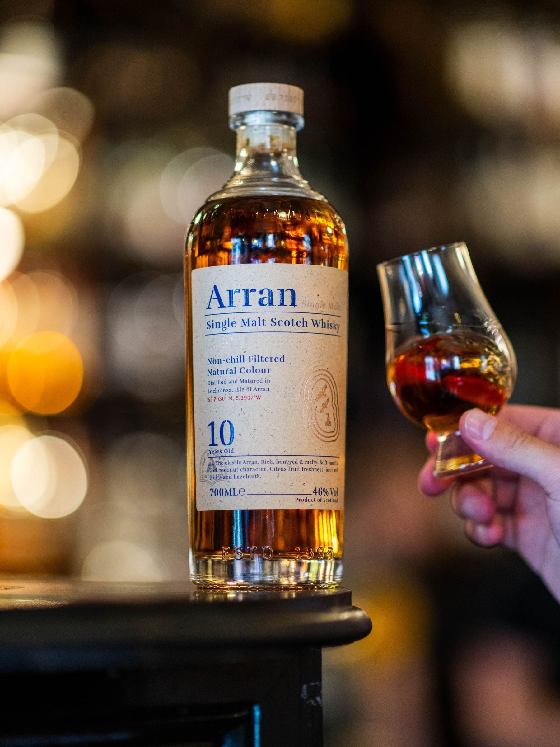 Ce malt d'Arran, vieilli 10 ans et titrant à 46 % vol., capture le style insulaire frais et unique de la distillerie éponyme de l'île d'Arran. Au nez, une riche douceur vanillée laisse place à la cannelle, tandis qu'en bouche, une texture douce et onctueuse révèle une pointe épicée. La bouche est douce, avec des notes de pomme et d'agrumes sur un fond de chêne. Livraison uniquement en Grande-Bretagne continentale.