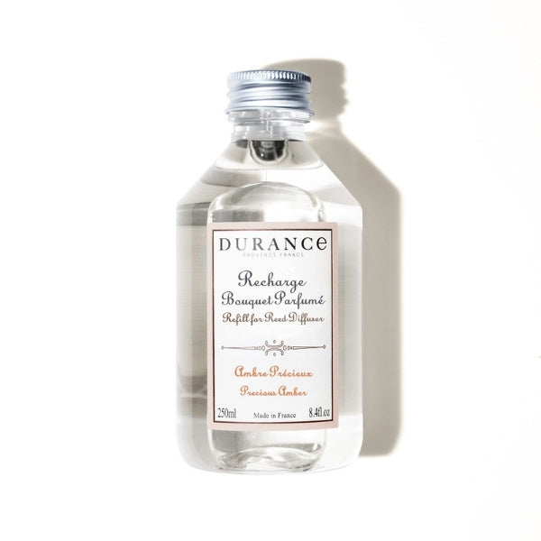Recharge Durance pour diffuseur à bâtonnets Ambre Précieuse 250 ml - Parfum d'intérieur de luxe français - Fabriqué artisanalement en Provence. Créez une ambiance chaleureuse et enveloppante grâce au parfum riche d'Ambre Précieuse. Rechargez votre diffuseur à bâtonnets avec le parfum luxueux d'Ambre Précieuse, une fragrance qui enveloppe votre intérieur de notes ambrées profondes et chaleureuses, sublimées par des facettes orientales révélant un sillage de vanille et de cèdre pour une évasion incomparable. Cette recharge de 250 ml vous permet de maintenir une atmosphère chaleureuse et enveloppante chez vous. Profil olfactif : Notes de tête : Ambre, Citron ; Notes de cœur : Ciste labdanum, Lavande, Rose ; Notes de fond : Patchouli, Vanille, Cèdre. Principaux avantages : Profitez longtemps : Cette recharge de 250 ml vous permet de recharger votre diffuseur à bâtonnets Durance plus de deux fois, pour environ deux mois de diffusion continue. Un choix durable : Recharger votre diffuseur est une option écologique qui réduit les déchets et vous permet de continuer à profiter de votre parfum préféré sans avoir besoin d'un nouveau diffuseur. Diffusion constante du parfum : Assure une diffusion continue, enveloppant votre intérieur du riche arôme d'Ambre Précieuse. Utilisation : Versez délicatement le liquide de recharge dans votre flacon de diffuseur Durance vide. Insérez de nouveaux bâtonnets de rotin naturel dans le flacon contenant le parfum. Laissez les bâtonnets s'imprégner du parfum et le diffuser naturellement dans la pièce. Pour un parfum plus intense, retournez les bâtonnets de temps en temps. Élaborée en collaboration avec des maîtres parfumeurs de Grasse, cette recharge de parfum Ambre Précieuse vous permet de continuer à transformer votre intérieur en un havre de paix chaleureux et accueillant, en l'enveloppant des arômes profonds et luxueux de Provence.