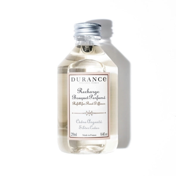 Recharge Durance pour diffuseur à bâtonnets Cèdre Argenté 250 ml – Parfum d'intérieur de luxe français – Fabriqué artisanalement en Provence. Créez une ambiance sophistiquée et boisée grâce à l'élégant parfum du Cèdre Argenté. Rechargez votre diffuseur à bâtonnets avec le parfum luxueux du Cèdre Argenté, une fragrance qui mêle harmonieusement la richesse du cèdre de l'Atlas à la douceur veloutée du santal et aux notes camphrées du patchouli, pour un arôme mystérieux et envoûtant. Cette recharge de 250 ml vous permet de maintenir une atmosphère raffinée et chaleureuse dans votre intérieur. Profil olfactif : Notes de tête : Cèdre de l'Atlas ; Notes de cœur : Santal velouté ; Notes de fond : Patchouli camphré. Principaux avantages : Profitez d'une utilisation prolongée : Cette recharge de 250 ml vous permet de recharger votre diffuseur à bâtonnets Durance plus de deux fois, pour environ deux mois de diffusion continue. Un choix durable : Recharger votre diffuseur est une option écologique qui réduit les déchets et vous permet de continuer à profiter de votre parfum préféré sans avoir besoin d'un nouveau diffuseur. Diffusion constante du parfum : Assure une diffusion continue, enveloppant votre intérieur de l'élégant arôme du Cèdre Argenté. Utilisation : Versez délicatement le liquide de recharge dans votre flacon de diffuseur Durance vide. Insérez de nouveaux bâtonnets de rotin naturel dans le flacon contenant le parfum. Laissez les bâtonnets s'imprégner du parfum et le diffuser naturellement dans la pièce. Pour un parfum plus intense, retournez les bâtonnets de temps en temps. Élaborée en collaboration avec des maîtres parfumeurs de Grasse, cette recharge de parfum Cèdre Argenté vous permet de continuer à transformer votre intérieur en un havre de paix raffiné et accueillant, en l'enveloppant des arômes riches et sophistiqués de Provence.