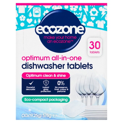 Ecozone's Optimum All-in-One Dishwasher Tablets provide a deep clean & brilliant stainless steel shine, thanks to its powerful decrusting & degreasing action with added instant glass protection. The formula also provides an extra dry effect & has been optimised to work hard & provide sparkling results even at low temperatures.