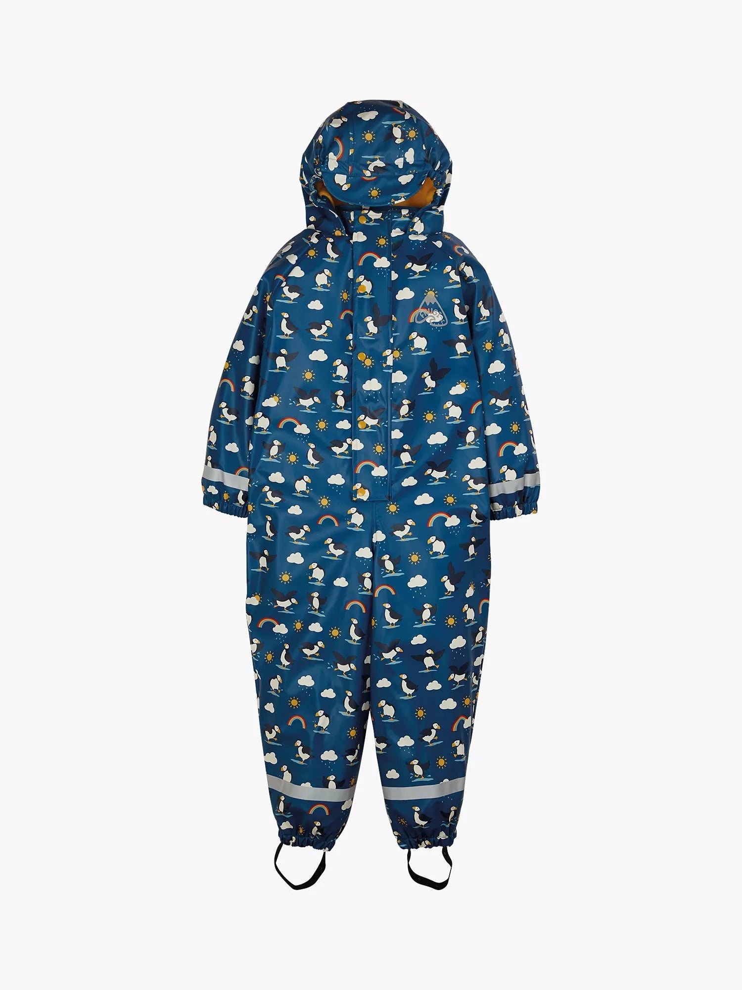 Combinaison imperméable Frugi à imprimé macareux et arc-en-ciel. Coutures soudées pour une imperméabilité optimale et doublure polaire douce pour plus de chaleur. Fabriquée à partir de bouteilles en plastique recyclées, elle est dotée d'une capuche et de poignets élastiqués, d'éléments réfléchissants pour plus de sécurité, d'une fermeture éclair et de boutons-pression avec mentonnière, ainsi que de repose-pieds élastiqués amovibles et réglables.