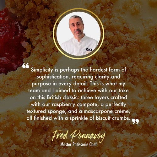 Gu reimagines the traditional British Victoria Sponge cake into convenient serving pots. Each serving combines distinct layers crafted with care by Master Patisserie Chef Fred Ponnavoy. This creation focuses on achieving sophistication through clarity and purpose in every component.