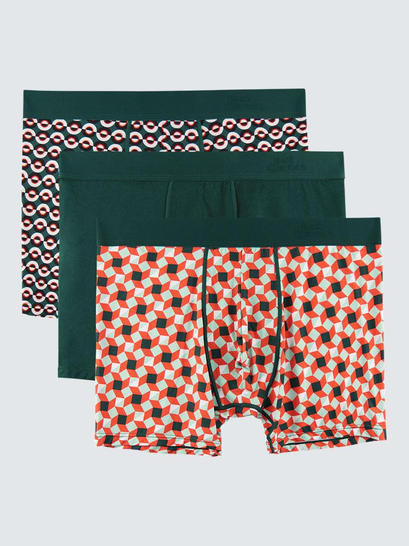 Découvrez les boxers JustWears Pro, un lot pratique de trois boxers aux motifs géométriques uniques. Confectionnés en MicroModal Air, une matière biologique ultra-douce, ces boxers offrent un toucher plus soyeux que la soie. Neutre en carbone, biodégradable et hautement absorbant, ce matériau vous garde naturellement au frais.