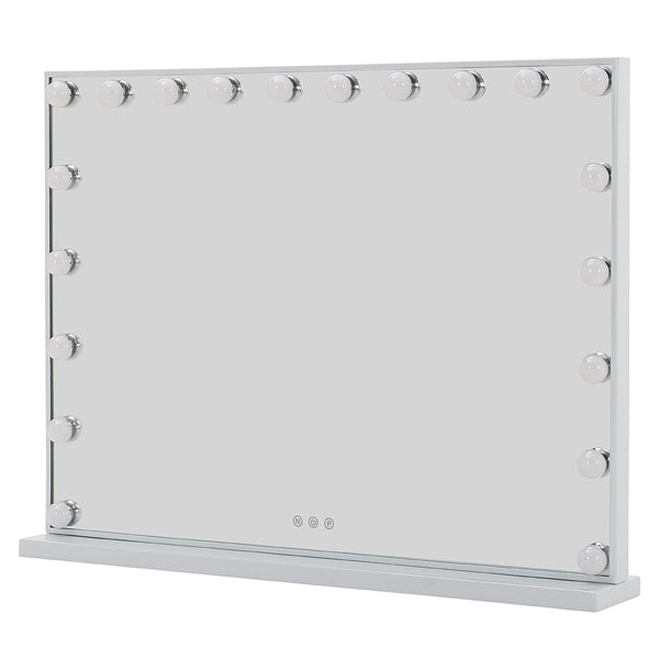 Port de chargement USB pratique à l'arrière. 3 températures de couleur réglables pour créer l'ambiance maquillage parfaite. Écran tactile réactif, simple et intuitif. Socle et cadre en métal robuste, finition blanche. Dimensions : 80 cm (L) x 12 cm (P) x 62,5 cm (H). Type de fixation : Autoportant. Matériau du cadre : Métal. Alimentation : USB. Éclairage inclus : Oui. Intensité lumineuse réglable : Oui. Type d'ampoule : LED. Nombre d'ampoules : 20.