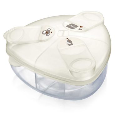 The MAM Milk Powder Box offers a convenient solution for preparing baby formula when away from home. Its unique triangular shape assists with neat pouring directly into bottles. This lightweight container simplifies feeding time while travelling or outdoors.