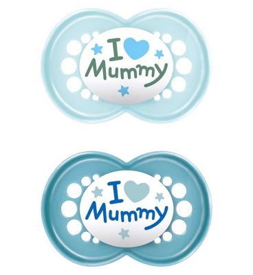 This MAM Original Style Soother pack contains two pacifiers specifically designed for babies aged 16 months and over. The unique circular shield features a charming "I ♥ Mummy" graphic, celebrating the parent-child bond. These soothers incorporate MAM's well-regarded orthodontic nipple shape.