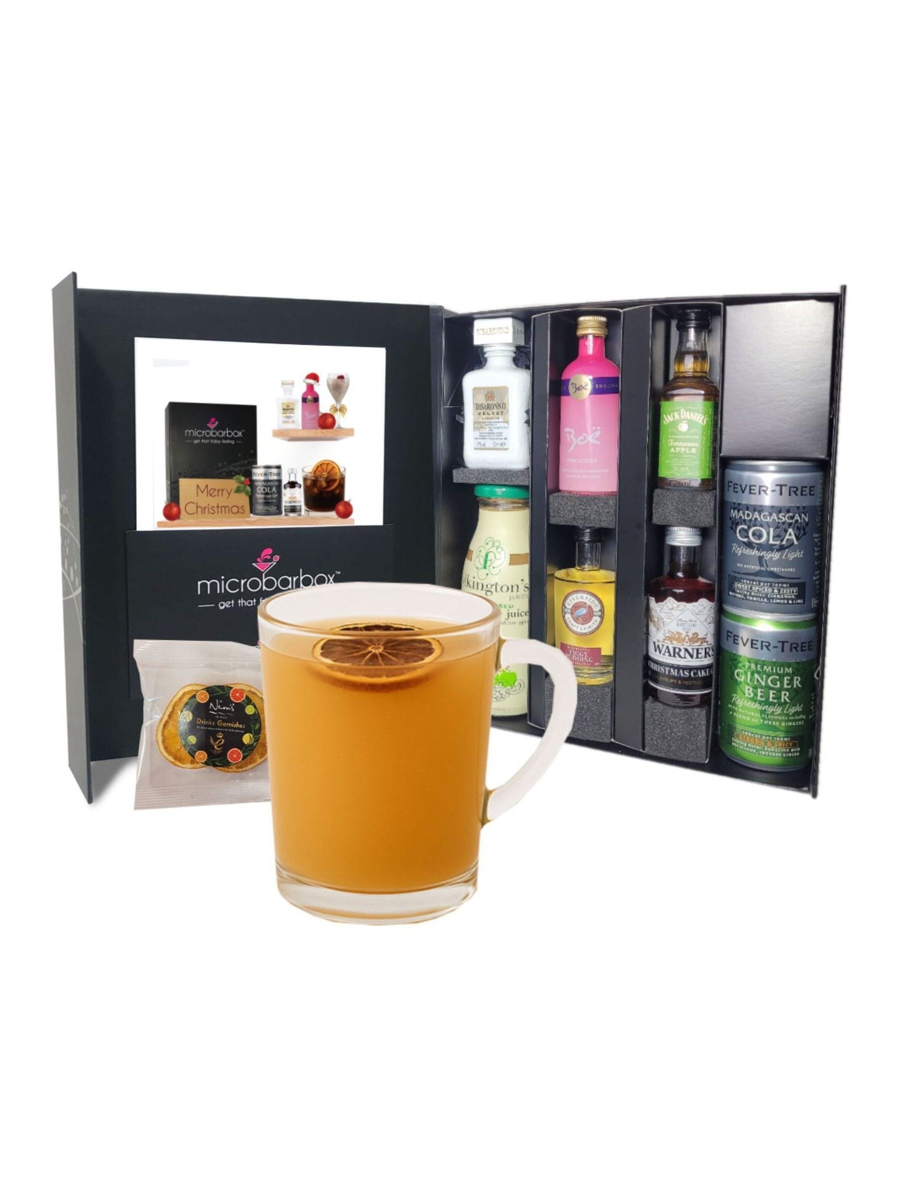 Offrez la magie des fêtes avec ce magnifique coffret de cocktails de Noël Micro Bar Box, présenté dans un luxueux coffret à fermeture magnétique. Laissez-vous tenter par les saveurs réconfortantes d'un Martini Pain d'épices ou portez un toast aux fêtes avec le doux et onctueux Christmas Kiss. Pour les plus audacieux, le Dark Christmas Night offre une expérience riche et savoureuse, tandis que le Christmas Pudding Mule apporte une touche épicée et fruitée à vos festivités de Noël. C'est le coffret idéal pour illuminer vos fêtes de fin d'année ! Ce coffret contient 4 cocktails : Martini Pain d'épices, Baiser de Noël, Nuit de Noël sombre et Mule Pudding de Noël. CONTENU DU COFFRET : Liqueur de vodka Pain d'épices (20 % vol.) 50 ml, Liqueur de vodka Pudding de Noël (20 % vol.) 50 ml, Liqueur de crème irlandaise Baileys (17 % vol.) 50 ml, Liqueur de rhum Riverside Figgy Pudding (20 % vol.) 50 ml, Liqueur de framboise noire Chambord (17 % vol.) 50 ml, Liqueur de crème d'amaretto Disaronno Velvet (17 % vol.) 50 ml, Bière de gingembre Folkington's 250 ml. Verres non inclus. Ce coffret cadeau de cocktails de Noël contient 5,5 unités d'alcool.