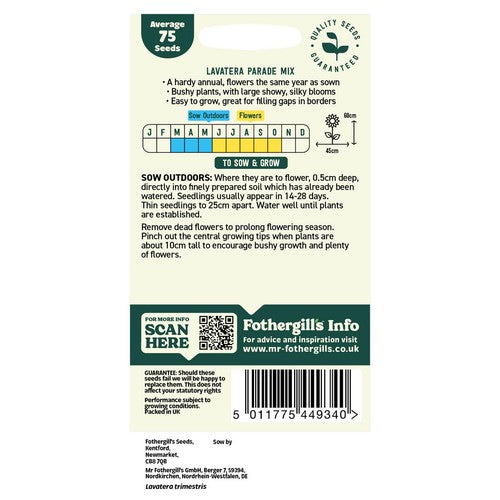 Start your garden easily with Mr Fothergills Oh Sow Simple Lavatera Mix, providing 75 seeds perfect for beginner gardeners. This hardy annual variety ensures you enjoy colourful blooms within the same growing season you sow them.