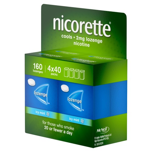 Read MoreReady to quit smoking? Help control cravings in a fast and easy way with Nicorette Cools 2mg nicotine lozenges, clinically proven to start relieving cravings in just 2 minutes. Nicorette Lozenges are an easy and discreet stop smoking aid that can fit into your pocket, purse, bag or backpack and you'll be ready whenever cravings strike. Nicorette lozenges use their fast flavour technology to provide a refreshing Icy Mint taste. This is delivered by a rapid burst of flavour from the outer coating and additional flavour released from the inner core. Nicorette Lozenges are available in 2mg and 4mg strengths. Choose 2mg nicotine lozenges if you smoke 20 cigarettes or fewer a day or 4mg nicotine lozenges if you smoke more than 20 cigarettes a day. Nicorette 2mg nicotine lozenges are now available in convenient larger quantity packs of 40, 80 and 160 pieces. Choose Nicorette Lozenges to help you on your quit smoking journey. Nicorette Cools 2mg Lozenge contains nicotine. Stop smoking Aid. Requires willpower. Always read the label.