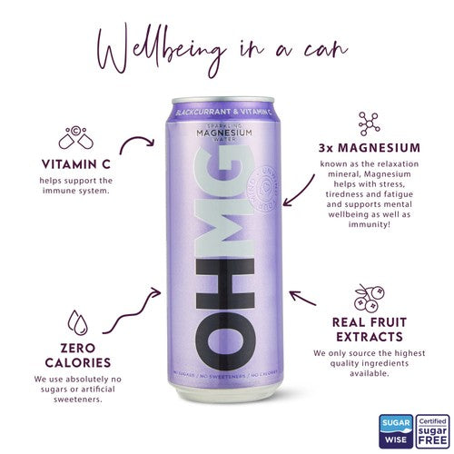 OHMG Blackcurrant offers a refreshing sparkling spring water base. This functional beverage is infused with magnesium and natural fruit flavours, with nothing else added. It is formulated to support modern lifestyles by providing essential minerals in a convenient format.