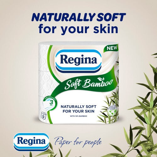 Read MoreExperience pure softness every day with Regina Soft Bamboo toilet roll. With its innovative use of pure cellulose and 10% bamboo fibres, it’s our softest toilet tissue ever manufactured . The pack contains 9 toilet rolls, each with 160 3-ply sheets. Packaged in recyclable paper, Regina combines natural softness with care for the planet.