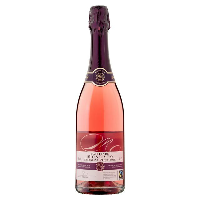 Sainsbury's Taste the Difference Fairtrade Moscato Rose 75cl provides a light frizzante wine experience. Fermentation stops early, ensuring the natural summer fruit flavours remain vibrant and intense. Notes of juicy strawberry meet tart raspberry, plus a touch of sweet cream. This selection directly aids community upliftment in the Western Cape area.