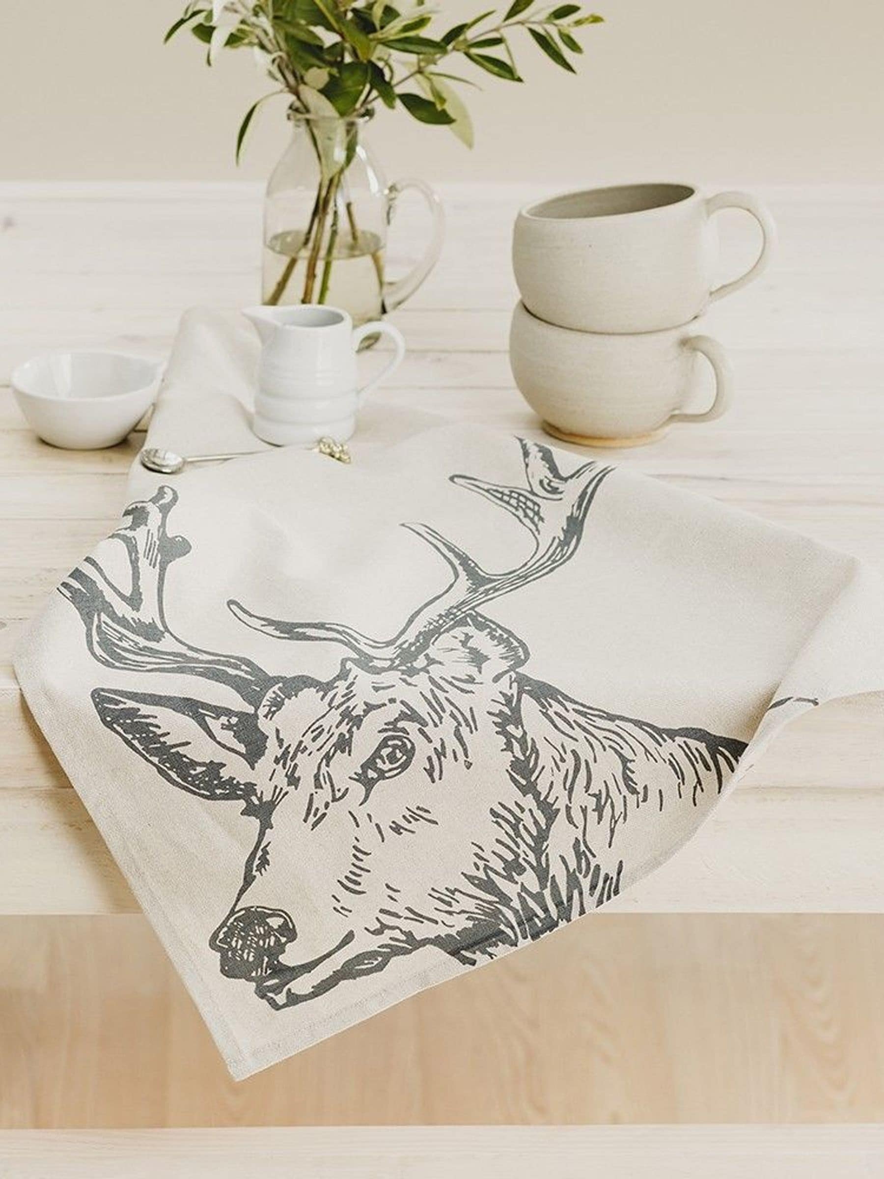 Un torchon en lin naturel d'une simplicité élégante, imprimé à la main avec un magnifique motif de cerf. Le lin naturel est idéal pour les torchons, et ce motif de cerf apportera une touche de sophistication discrète à votre cuisine.