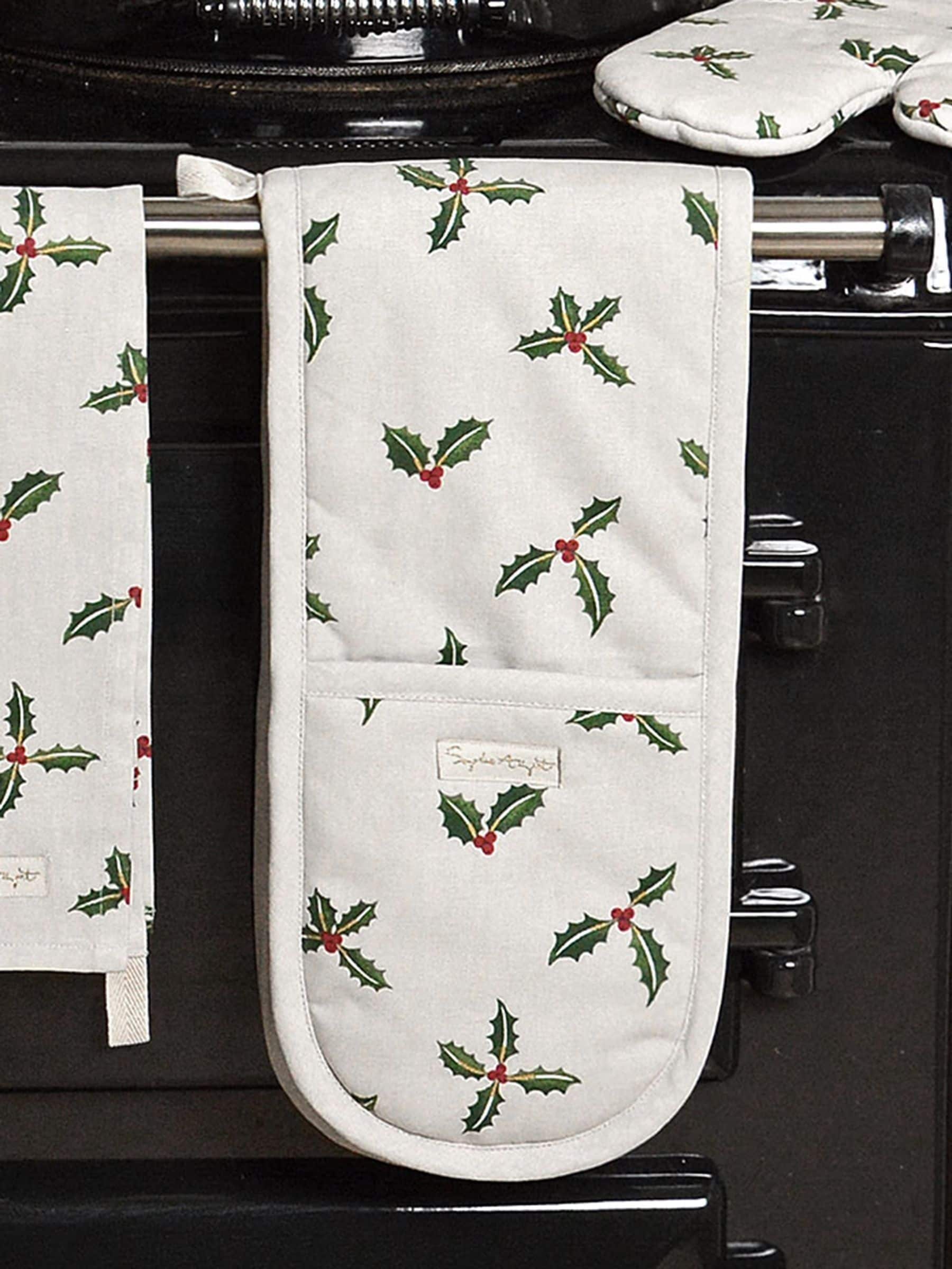 Indispensable en cuisine pour les fêtes, ce gant de cuisine double au design élégant arbore un motif classique de houx vert et de baies rouges éclatantes sur un fond pierre neutre. Doté d'une doublure thermique en polyester pour une protection accrue et d'une boucle de suspension pratique, il est à la fois pratique et élégant pour vos préparations de Noël. Dimensions : L 84 x l 18 cm. Composition : 100 % coton. Doublure thermique en polyester. Boucle de suspension pour un rangement facile. Collection Houx et Baies.