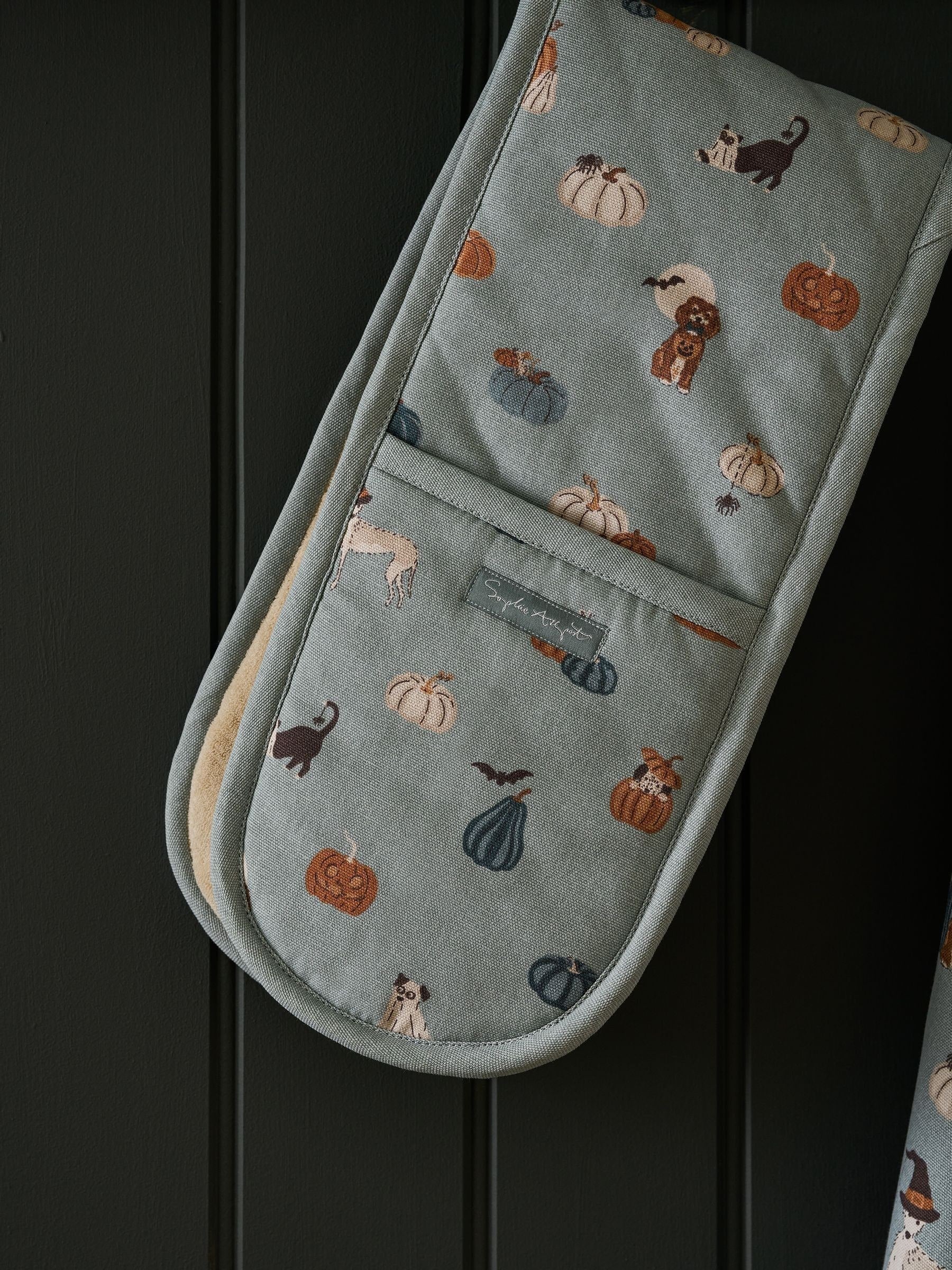 Protégez vos mains avec style grâce à cet adorable gant de cuisine double. Orné de chiens et de chats espiègles déguisés pour Halloween sur un fond bleu turquoise doux, il est rembourré pour une protection optimale et confectionné en 100 % coton. Doté d'une boucle pratique pour le suspendre, il sera l'accessoire automnal idéal dans votre cuisine. Dimensions : L 84 x l 18 cm. Composition : 100 % coton. Doublure thermique en polyester. Boucle de suspension. Le motif peut légèrement varier. Retrouvez les articles assortis dans la collection Pattes et Citrouilles. Taille : Unique.