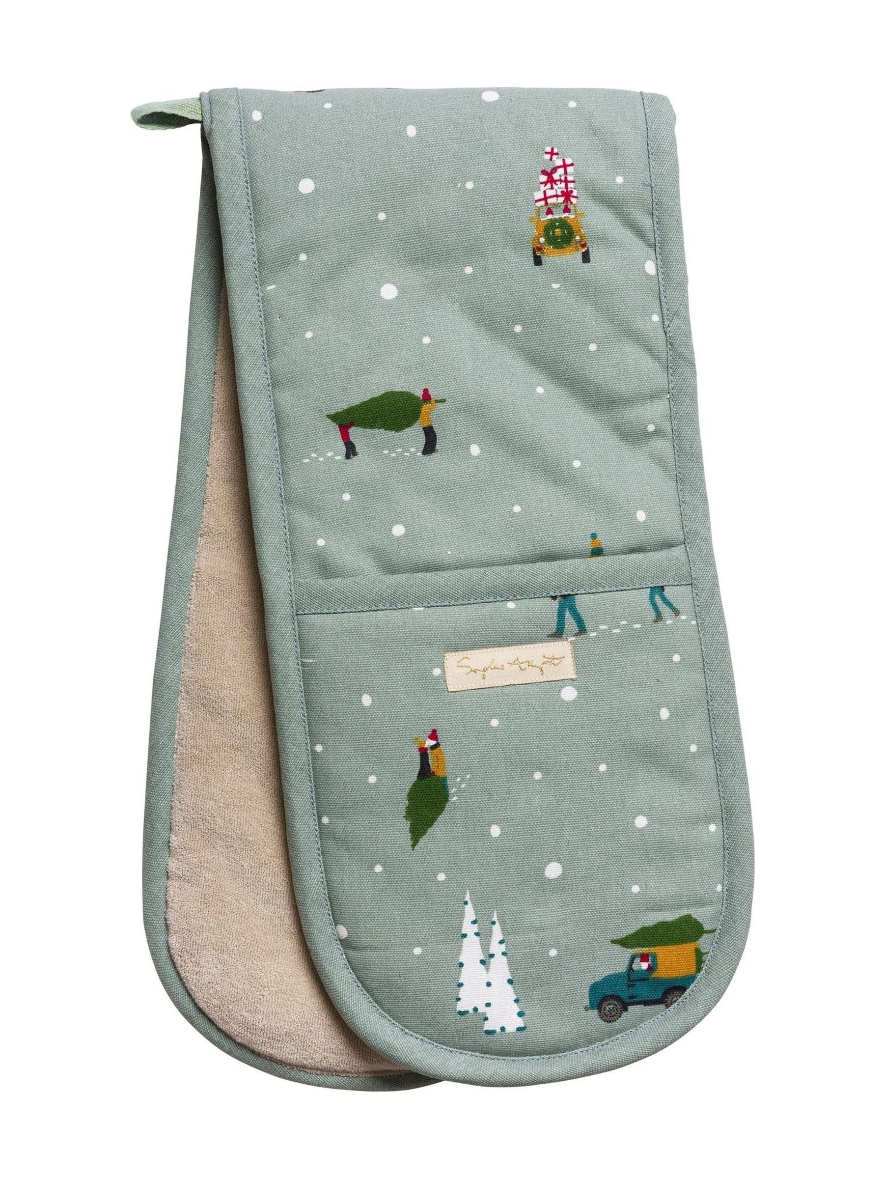 Capturez la magie des fêtes avec ce charmant gant de cuisine, orné de sapins de Noël, de traîneaux et de voitures chargés de cadeaux sur un fond bleu hivernal. Idéal pour protéger vos mains lors de la préparation des repas de fête, c'est un indispensable pour toute cuisine pendant les fêtes. L 84 x l 18 cm. 100 % coton. Doublure thermique en polyester. Boucle de suspension pour un rangement facile. Collection « Home for Christmas ».