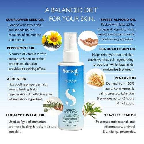 Sorted Skin Intensive Rescue Spray is a convenient fast-acting liquid spray that offers instant hydration and relief from symptoms of dry, atopic and sensitive skin breaking the itch-scratch cycle on contact. It provides quick relief from itchy dry skin and aids wound healing and skin regeneration. Developed with prebiotic ingredients, vitamins, minerals, nutrients and 15 natural essential oils and extracts.