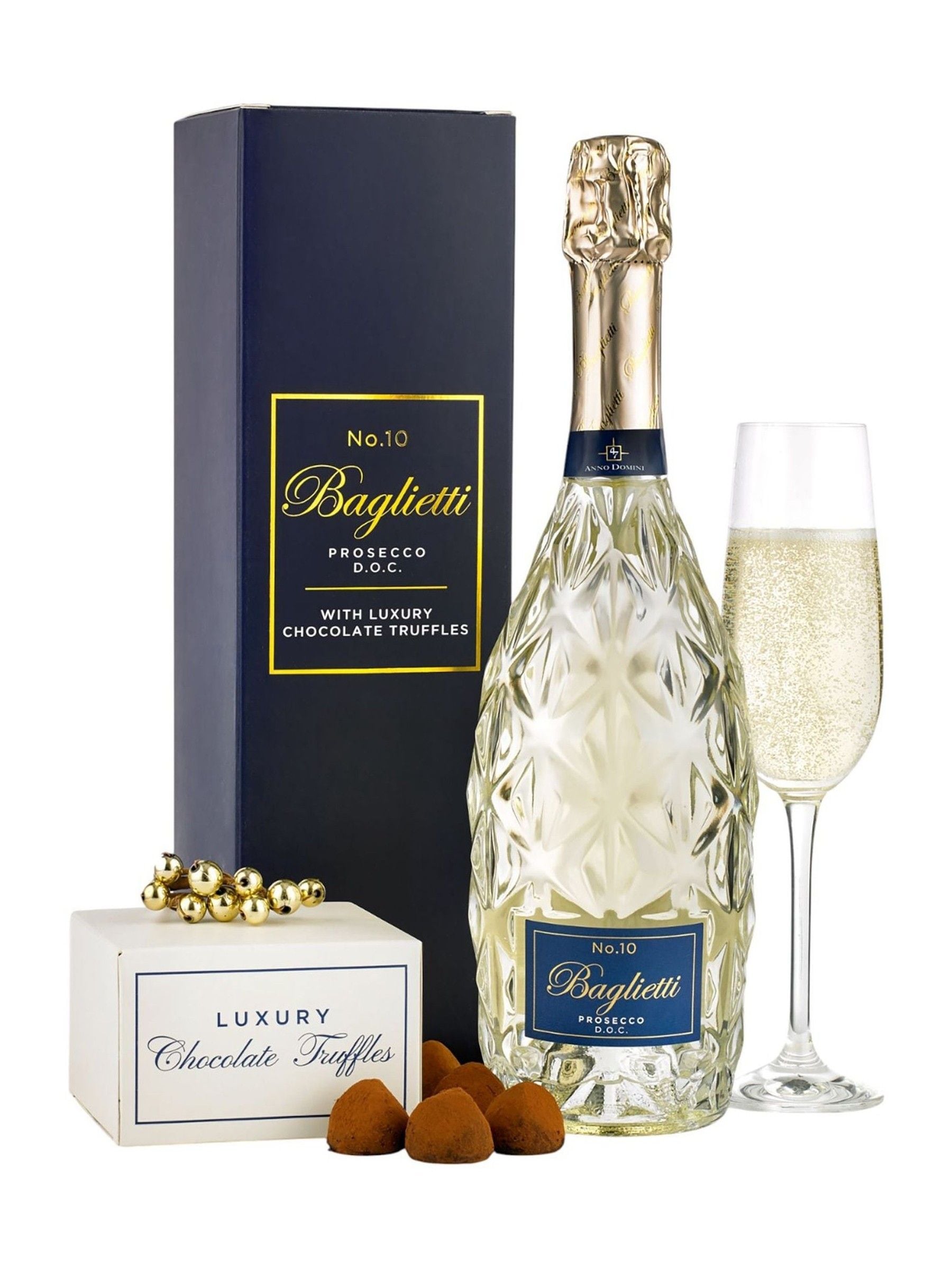 Truffes classiques Jacquot 200g, Prosecco Baglietti No10 75cl, présentés dans un élégant coffret cadeau de marque.