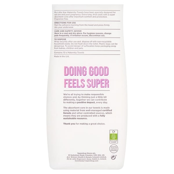 Superdrug My Little Star Maternity Towels provide essential protection and comfort for new mothers throughout the postnatal recovery period. This package contains ten individually wrapped pads designed for discreet and reliable wear. They are an important item to include in your postpartum care preparation.