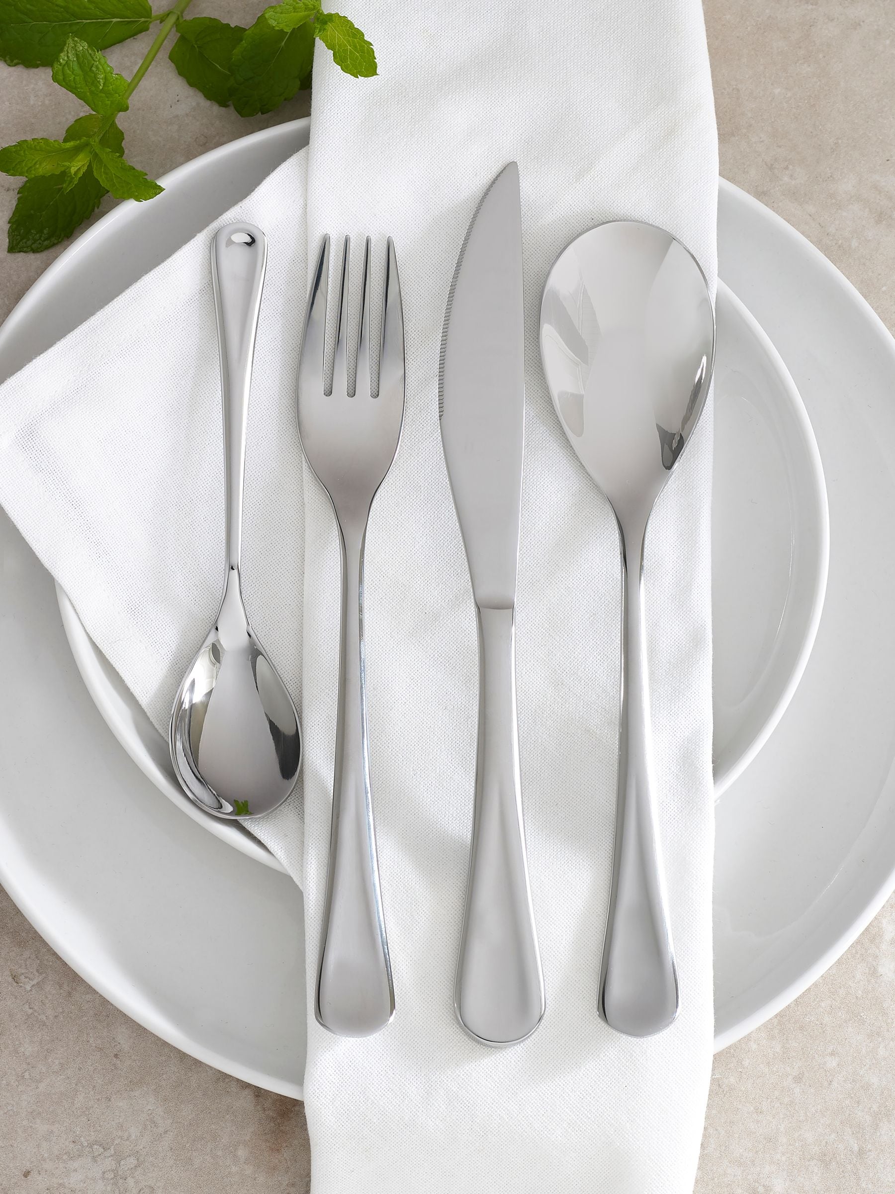 A modern and elegant addition to your table, this 16-piece cutlery set has a sleek, polished stainless steel finish with droplet-shaped handles for a sophisticated dining experience.