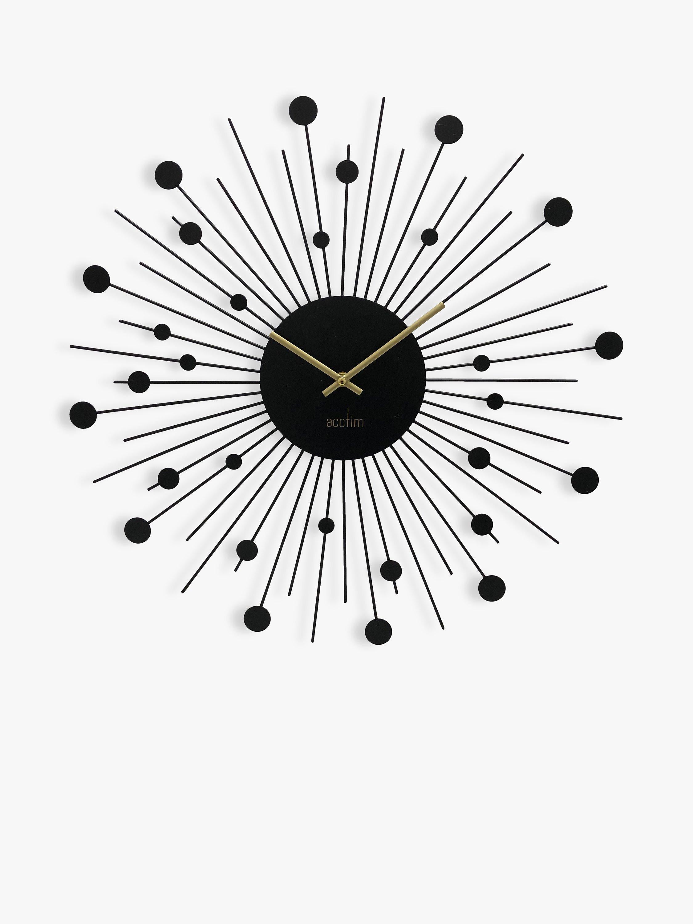 Acctim Brielle Metal Analogue Quartz Wall Clock measures 50cm across. This striking timepiece features a sunburst design with unique abstract circles and contrasting baton hands. Its reliable quartz movement ensures excellent timekeeping precision for any room in your home or office space. This large clock offers both style and function beautifully.