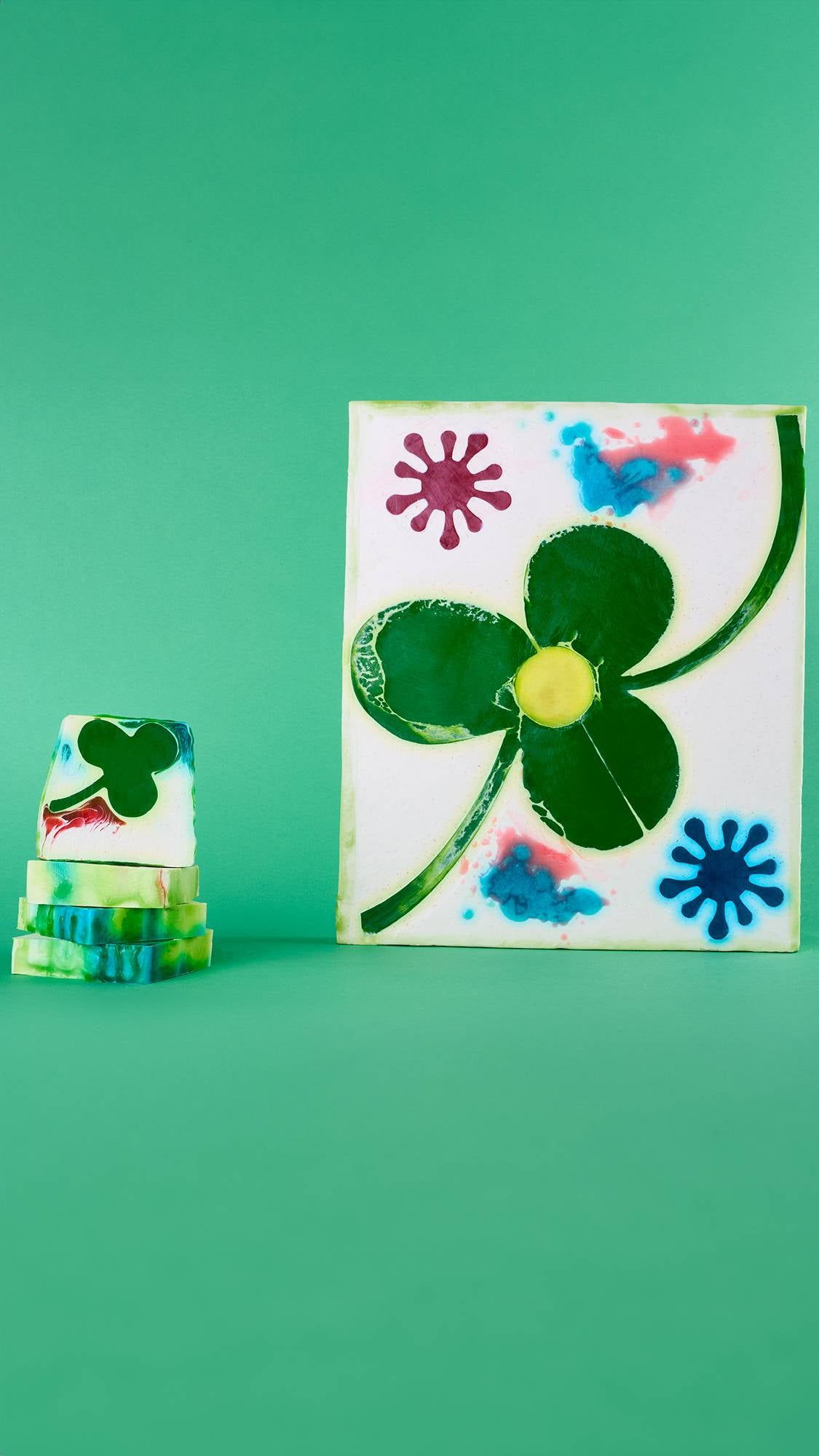 In addition to the 100g slices, large 2.8kg display versions of the soaps are available. Just like a painting on a canvas, these versions have additional details and decoration - from hand painted details to additional soap mixes dropped and swirled on top.