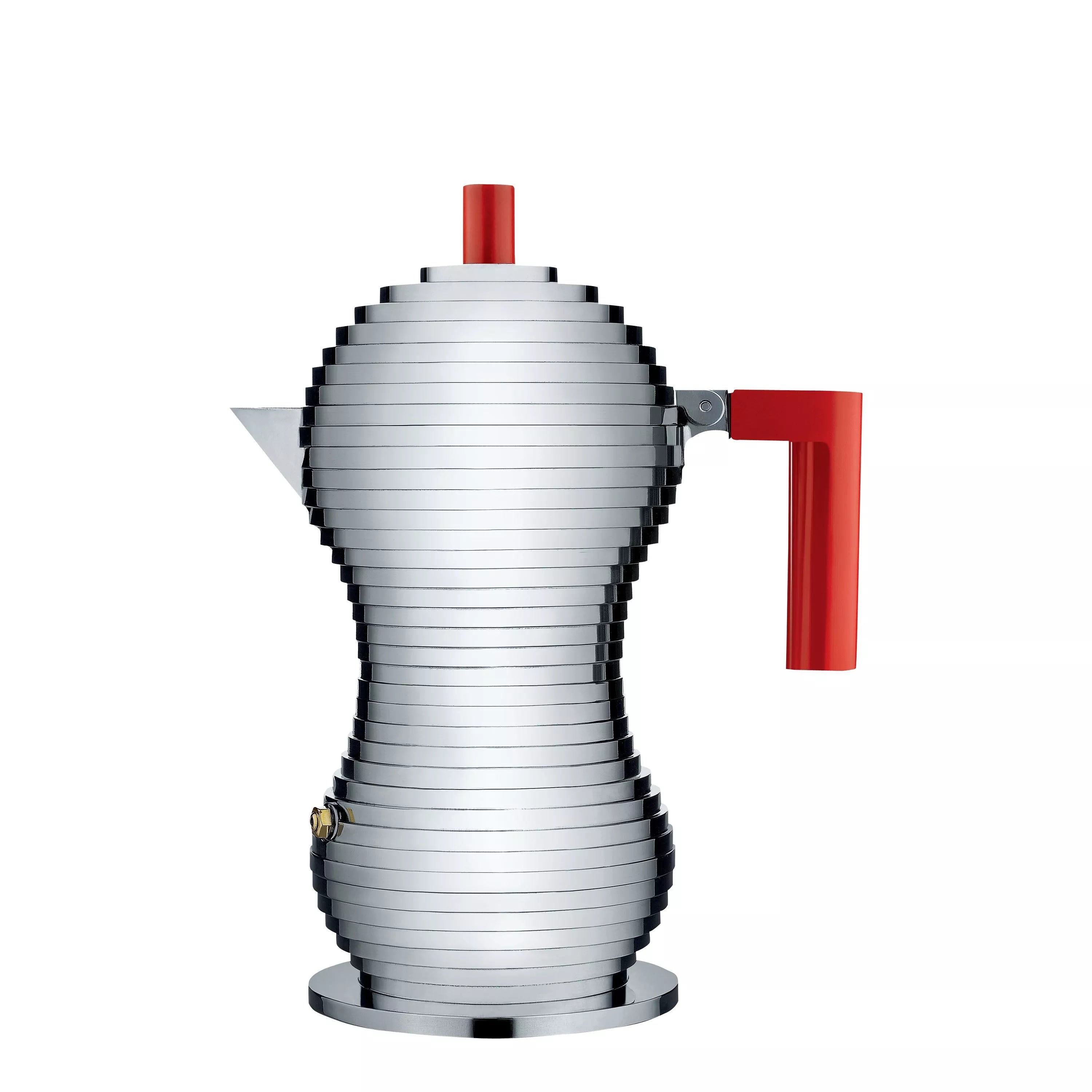 Alessi's Pulcina espresso maker is the result of a collaboration between designer Michele De Lucchi and Illycaffè. The goal was to optimise the coffee maker's shape to improve the properties of the coffee it produces and the experts at Illy's R&D Laboratory managed to identify some important areas for improvement. The changes they made have reduced and nearly eliminated the so-called 'Stromboli-volcano effect' that's common to many espresso makers and causes the burnt or bitter aftertaste. With Pulcina, only the finest qualities of the coffee are maintained through the brewing process.