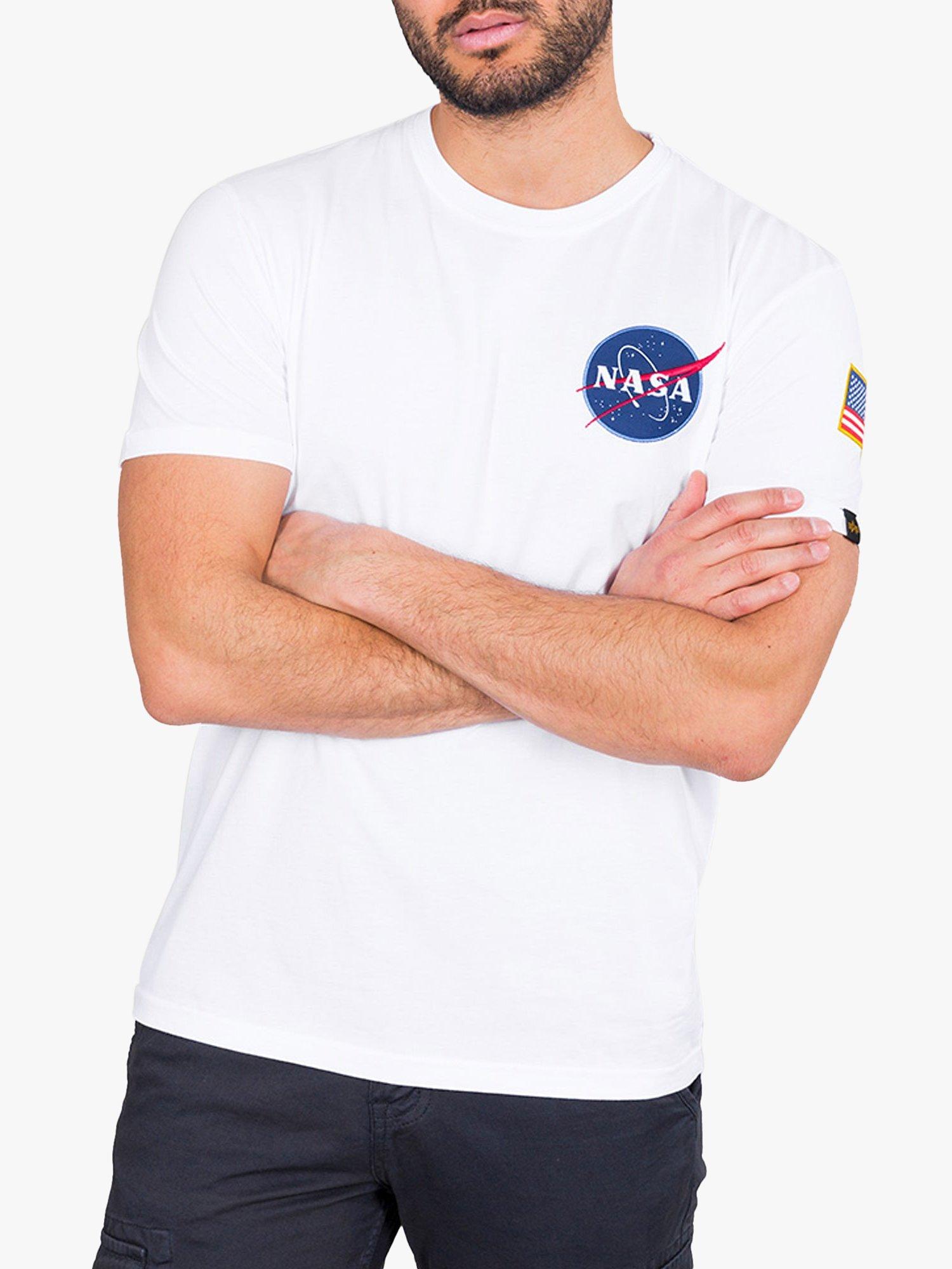 This Alpha Industries men's crew neck t-shirt celebrates the official NASA collaboration, essential designer apparel for Men. It is styled with short sleeves for easy, comfortable daily use. Look for the distinct embroidered NASA patch and unique reflective chest graphic detailing. This top provides authentic style for any wardrobe item.