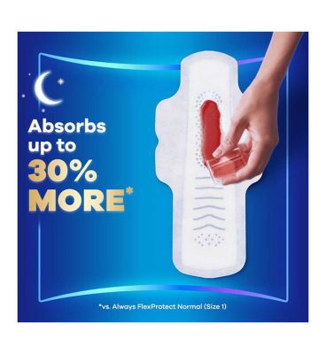 Read MoreAlways FlexProtect Night Extra Absorbency pads are made differenlty and work differently. Infinity FlexProtect sanitary towels are designed for up to Zero Feel and up to Zero Leaks. They offer you flexible protection. They feature our softest top layer and absorbs 20% more vs our Always Ultra Secure Night Pads. Additionally, Always FlexProtect Night Extra Absorbency pads offer 50% more coverage vs. Always FlexProtect Size 1. With Always Infinity FlexProtect pads your period is the last thing on your mind.