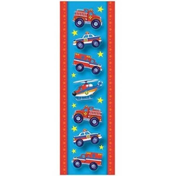 Contents: 7 Stickers. Design: Ambulance, Fire Engine, Helicopter, Police Car, Stars. Range: Rescue Team.