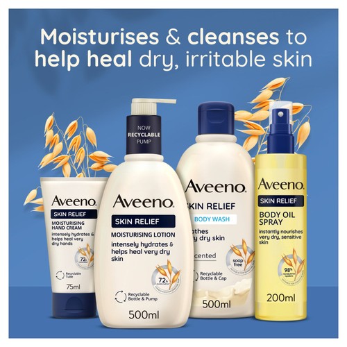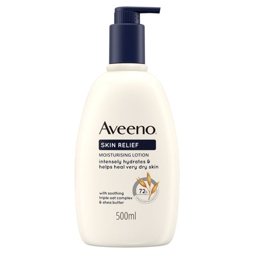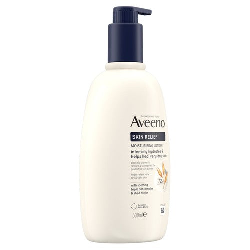 Read MoreAveeno Skin Relief Moisturising Lotion is clinically proven to intensely hydrate for 72-Hours* and to help heal very dry and itchy skin. Expertly formulated with soothing triple oat complex (oat extract, oat flour, and oat oil) and shea butter, strengthens the protective skin’s natural barrier to help protect the skin against external aggressors and supports the skin's natural ceramide production. s Its unscented, hypoallergenic† and vegan formula‡ is clinically proven suitable for dry and sensitive skin. It is also non-greasy and fast absorbing. *after 4 weeks continuous use. †Formulated to minimise the risk of allergies. ‡does not contain animal derived ingredients.