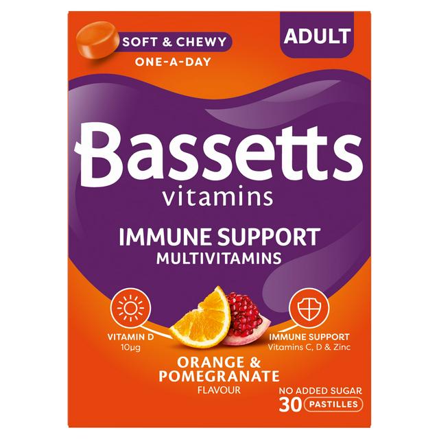 Product details Description Orange & Pomegranate flavoured multivitamin food supplement pastilles with sweeteners. Soft & Chewy Vitamin D 10μg Immune Support - Vitamins C, D & Zinc No Added Sugar Natural flavours Natural colours Contains naturally occurring sugars This tasty soft and chewy supplement contains Vitamins C & D and...