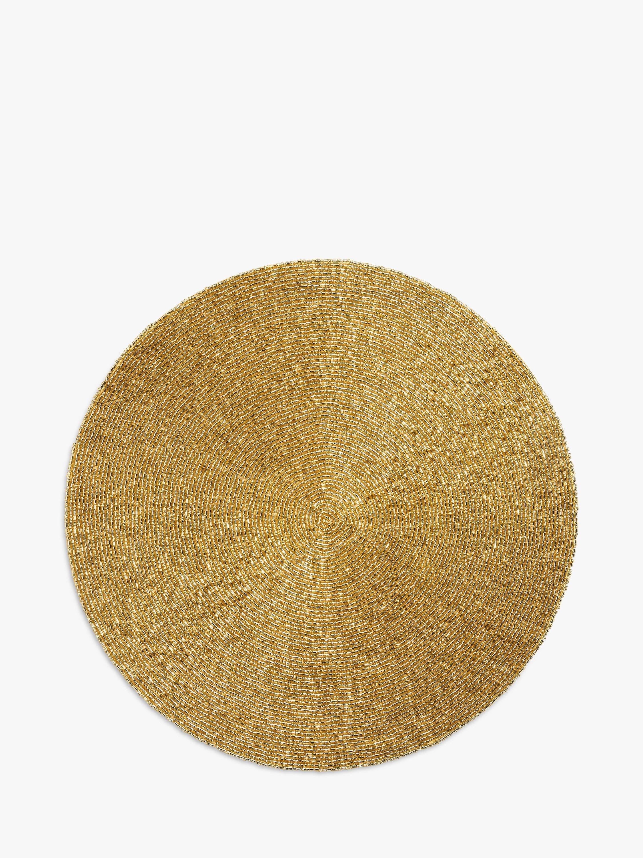 This John Lewis Round Placemat, sized appropriately for standard tableware, offers a striking decorative accent. It is genuinely handmade, featuring intricately woven gold glass beads that provide excellent tactile interest. This premium Table Linen piece ensures lasting quality and visual appeal for formal or casual dining environments.