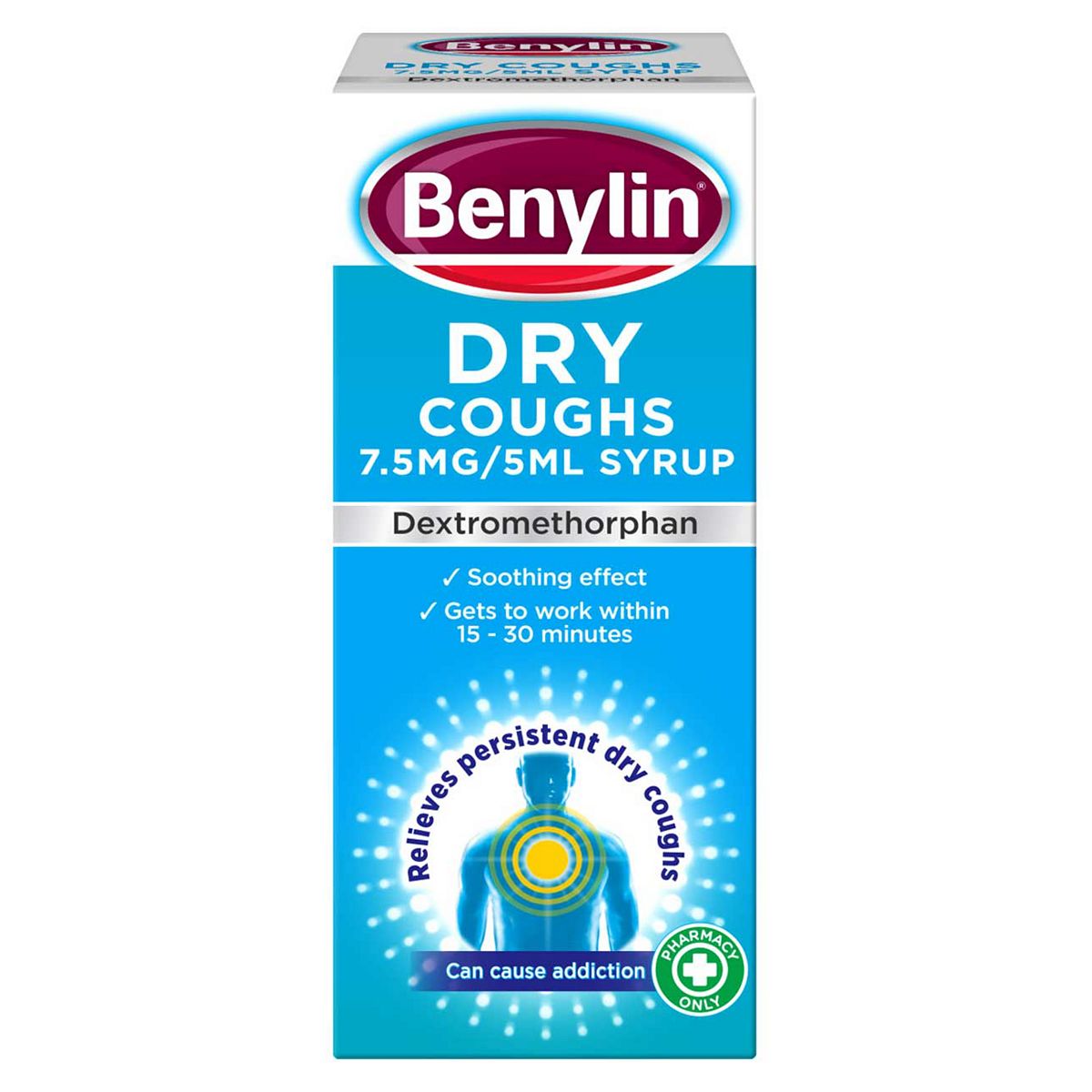 When you're suffering from a dry cough, but still want to get on with your normal daily routine, Benylin Dry Coughs 7.5mg/5ml Syrup has a soothing effect and relieves persistent, dry, irritating coughs.