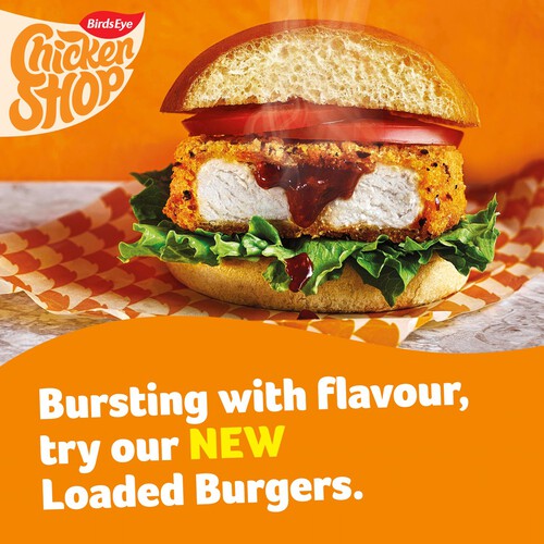 These Birds Eye Chicken Shop burgers feature a Tennessee Style BBQ coating and flavour profile. The product is supplied frozen for convenient storage and later preparation. Note that the '100% chicken breast' claim refers only to the meat component used in the burger.